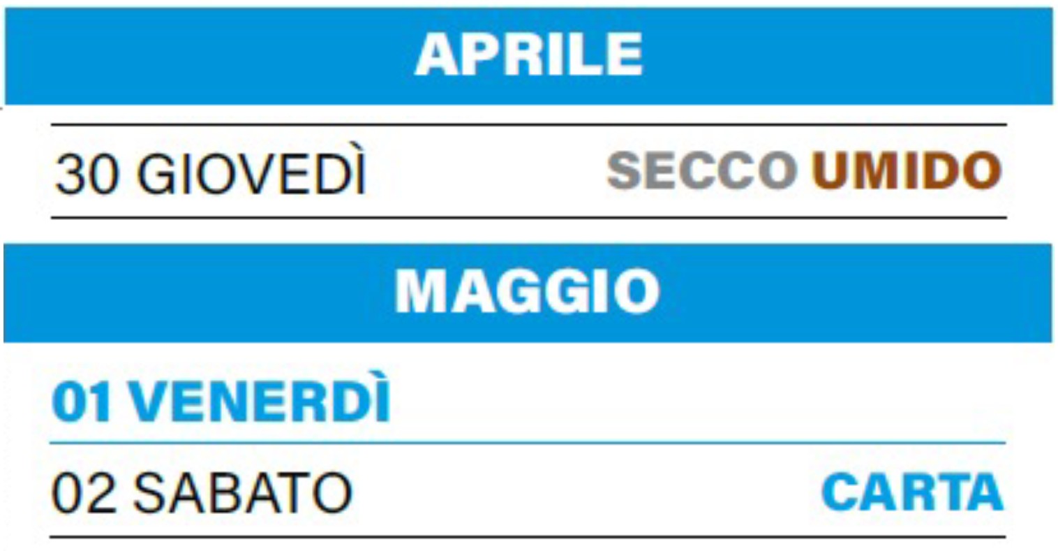 Si rammenta che, come previsto dall'ecocalendario, la raccolta dell'umido è anticipata da venerdì 1 maggio a giovedì 30 aprile unitamente al secco. La raccolta carta è posticipata da venerdì 1 maggio a sabato 2 maggio.